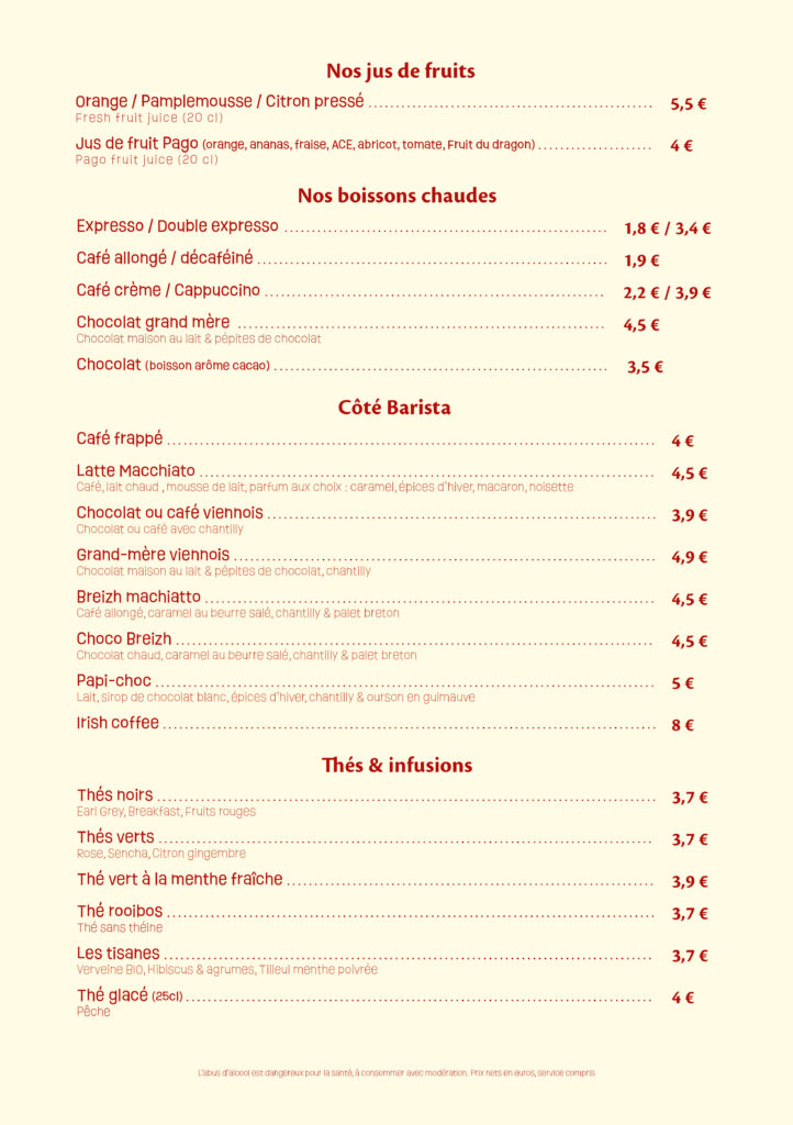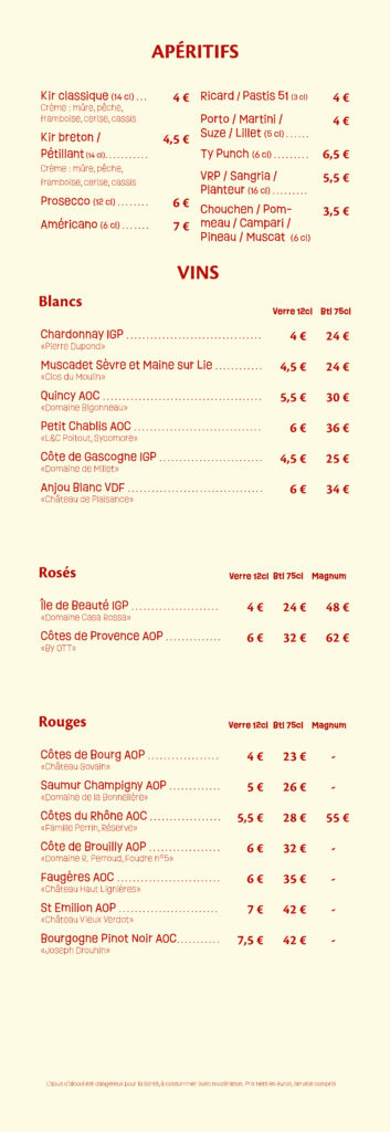 Notre carte bar vous propose une sélection de vins soigneusement choisis, bières pression et artisanales, cocktails classiques et créations maison, sans oublier cafés et boissons fraîches.