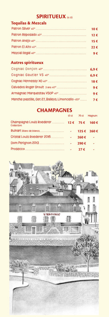 Côté bar, L’Armoric est aussi un lieu de vie où l’on aime se retrouver à toute heure de la journée. Vins soigneusement sélectionnés, bières pression, cocktails classiques et créations maison, cafés et boissons fraîches accompagnent aussi bien un apéritif au soleil qu’une fin de soirée animée. Que ce soit pour déjeuner, dîner ou simplement partager un verre en terrasse, L’Armoric incarne l’art de vivre à Saint-Goustan.