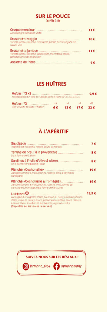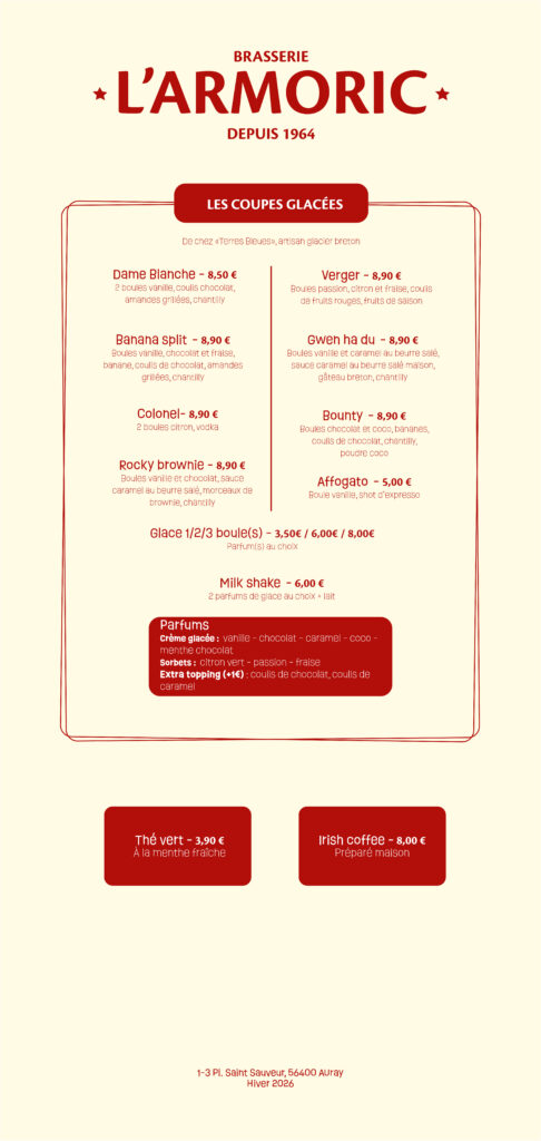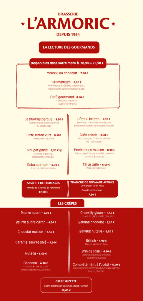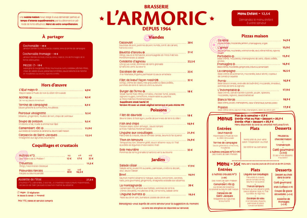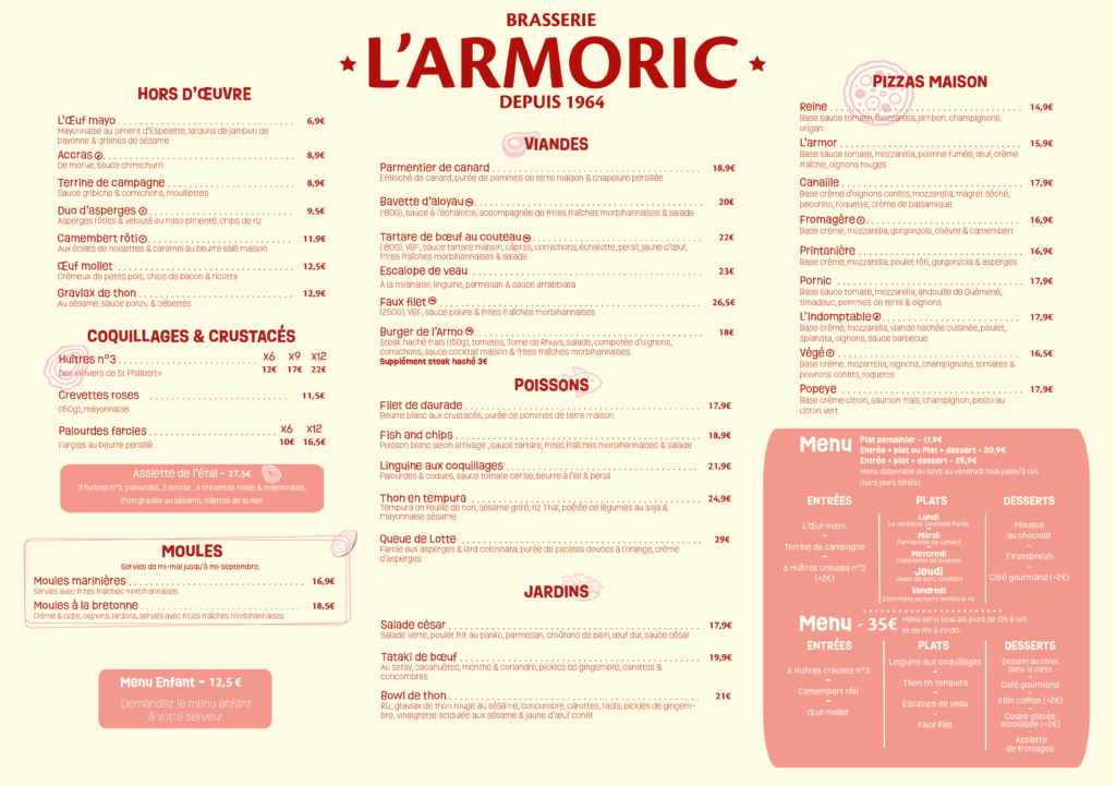 Du lundi au vendredi midi, découvrez également notre menu du midi, une formule complète et accessible composée d’une entrée, d’un plat et d’un dessert. Idéal pour une pause déjeuner conviviale, il évolue au fil des saisons et de l’inspiration du chef, tout en conservant l’esprit brasserie qui fait l’identité de L’Armoric.