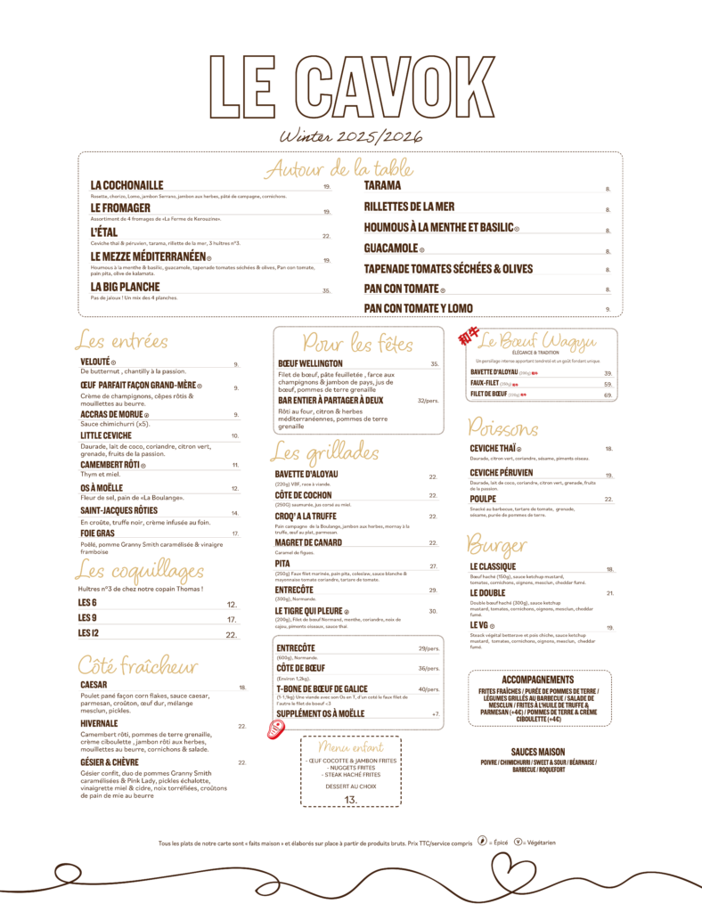 Le Cavok, c’est le rendez-vous des copains, des vacanciers et amoureux d’une belle table de février à novembre. On s y’ réunit dans une ambiance festive, musicale pour y manger une belle pièce de boeuf, partager une planche autour d’un cocktail ou d’une bonne bière pression.