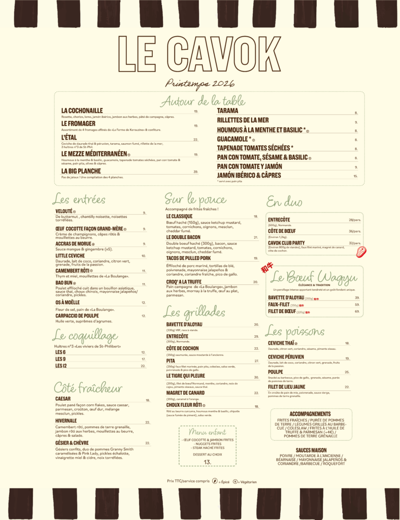 Au Cavok, la carte fait la part belle au partage : tapas, planches gourmandes, viandes, poissons et grands plats à savourer ensemble dans une ambiance conviviale et festive.